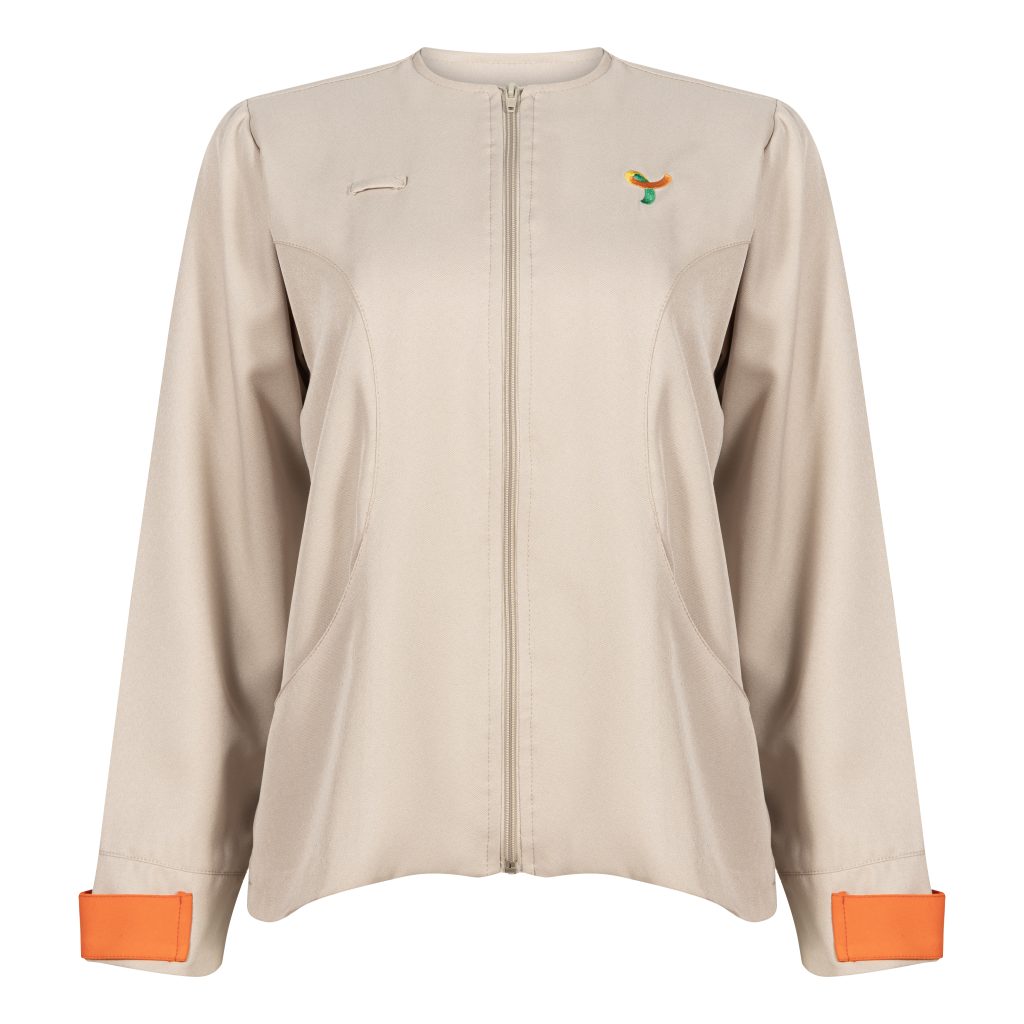 JAQUETA FEMININA EMOZIONE AREIA GOLA PADRE, RECORTE COM BOLSO, DETALHE NO PUNHO, ADM, TAUA JP